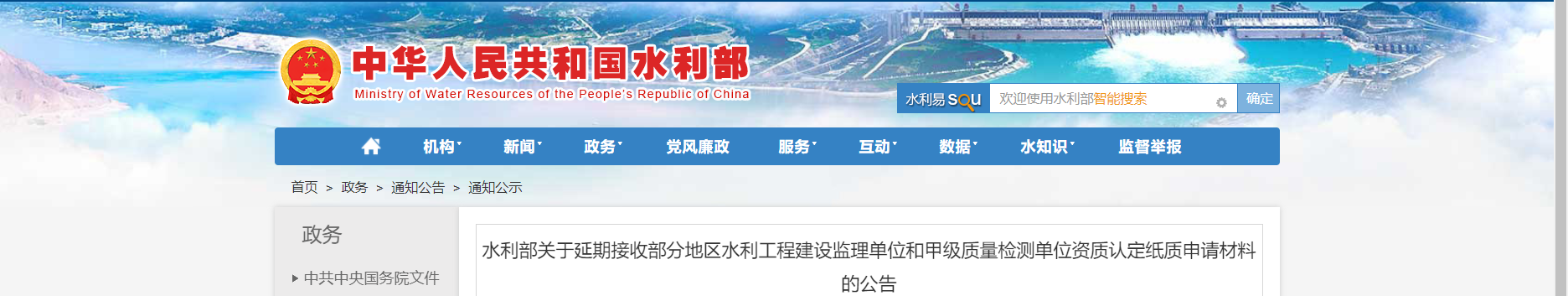 水利部關于延期接收部分地區水利工程建設監理單位和甲級質量檢測單位資質認定紙質申請材料的公告