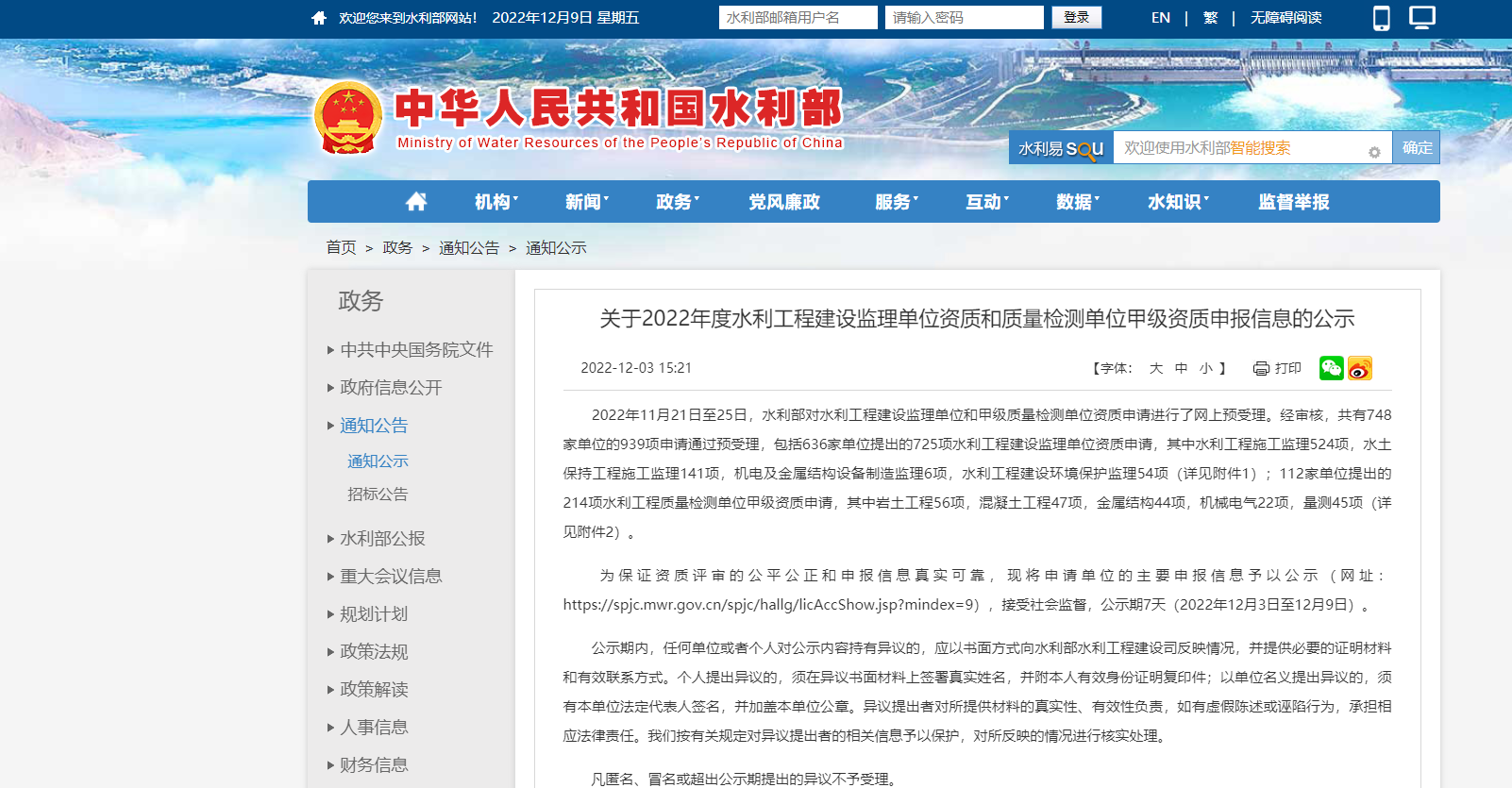關于2022年度水利工程建設監理單位資質和質量檢測單位甲級資質申報信息的公示